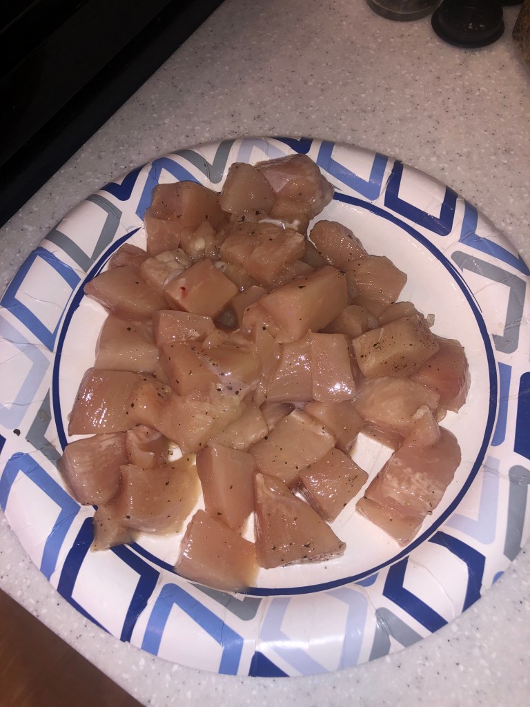 Turn on the stove and boil 6 cups of water. At the same time, slice the chicken breasts into equal-sized cubes. Add seasoning, I use a pinch of salt and pepper and set aside.