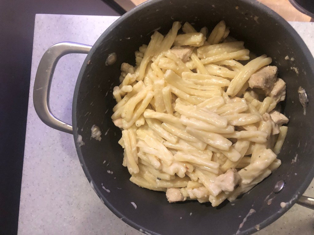 When the noodles are fully cooked, place the strainer in the sink and pour them in. Allow a couple of seconds to pass to prevent getting water everywhere. Off of the stove, add Alfredo sauce to the large pot then put in the cooked noodles. Check the chicken and make sure it is fully cooked.